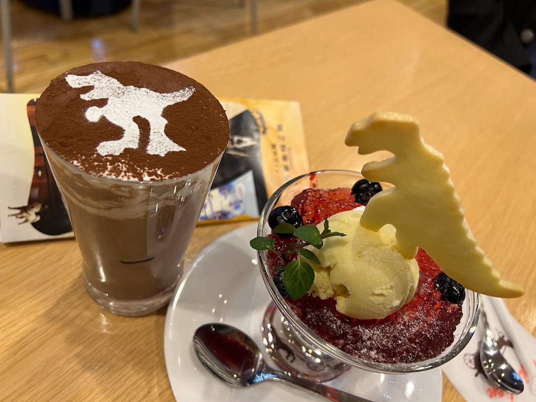 恐竜のデザート。 溶岩パフェは真っ赤な溶岩のようなジュレに恐竜がのっかってます。650円。 チョコレートドリンクには恐竜アートが。550円。 |