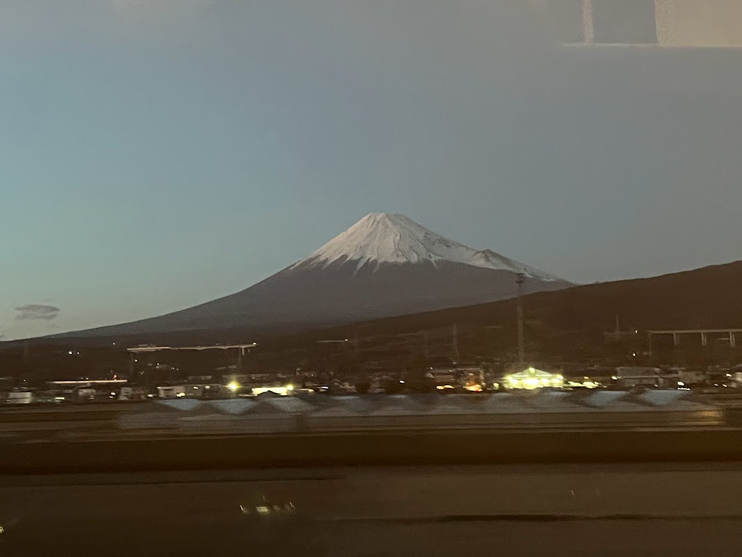 東京からの帰りは西に向かうので夕焼けの中にきれいなシルエットで富士山が見えます。 |
