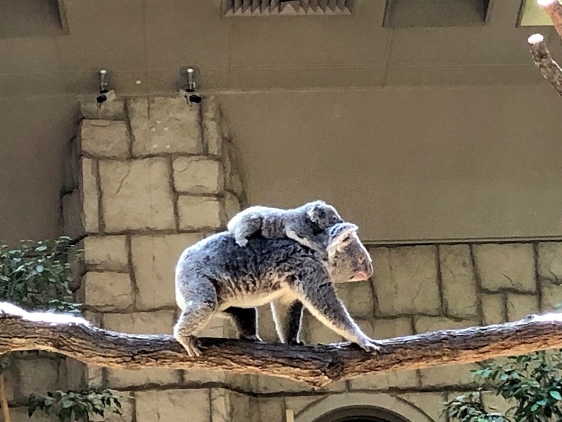 動物園の中でいちばんお金のかかっている獣舎、「コアラ舎」へ。 赤ちゃんをつれたおかあさんコアラがいました。 |