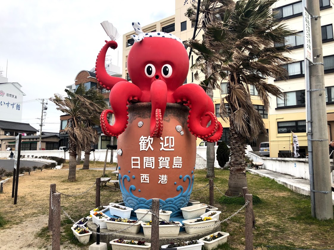 港からすぐの旅館まで歩きます。マンホールも「たこ」推し。 |