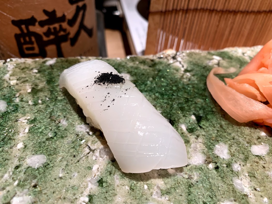 ここから握りがスタート。 いろいろでたけれど、イカ。おいしいです。 |