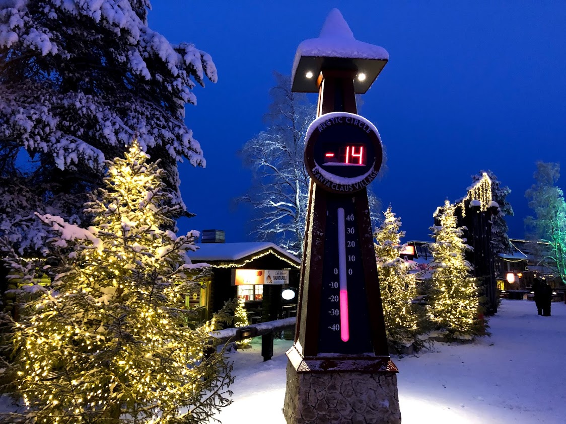 北極圏がサンタクロース村を通り抜けています。北極圏は太陽が24時間連続して地平線の上もしくは下にある最南端の緯度のことです。この現象は夏は白夜、冬は極夜としてして知られています。青い線が北極圏の境界です。
