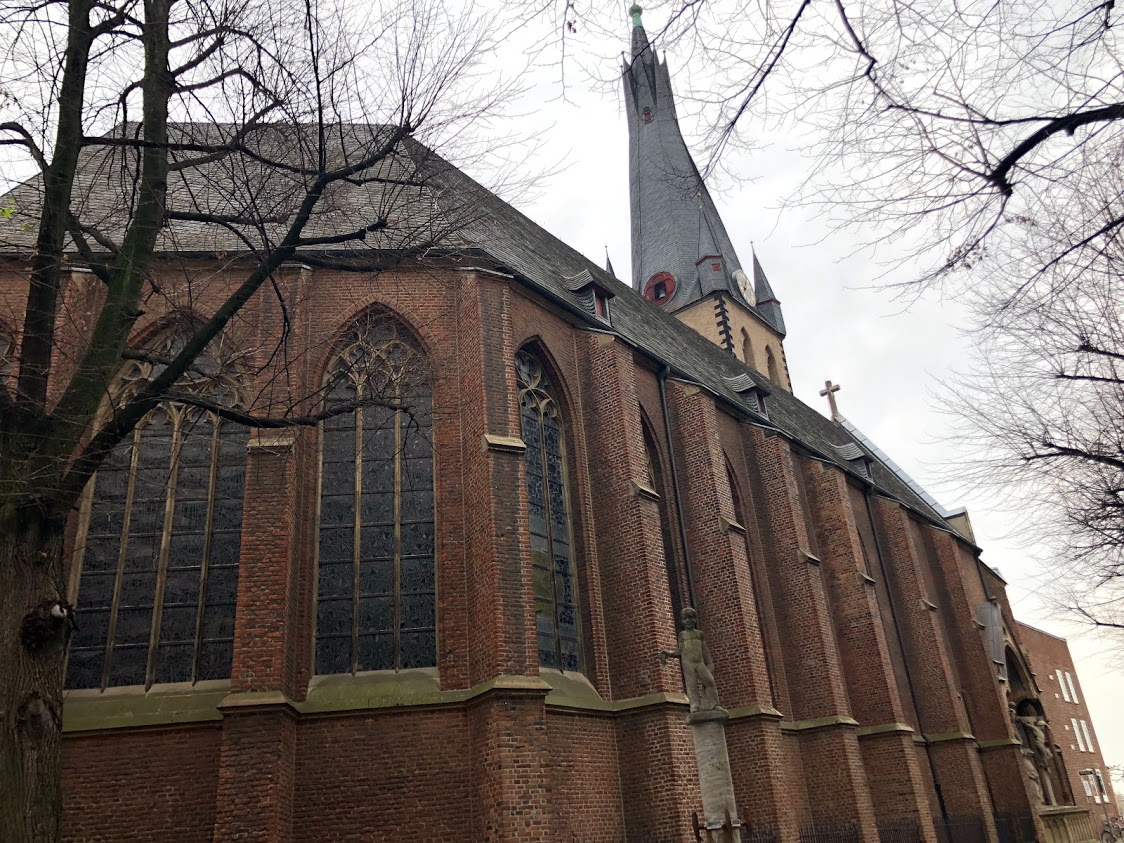 ライン川沿いの遊歩道を歩いて「ラインタワー」へ行きます。教会の横を抜けるとライン川です。これは1206年に建てられ、1288年から1394年にかけて拡大されたSt. Lambertus教会です。1815年の落雷の後に再建されています。