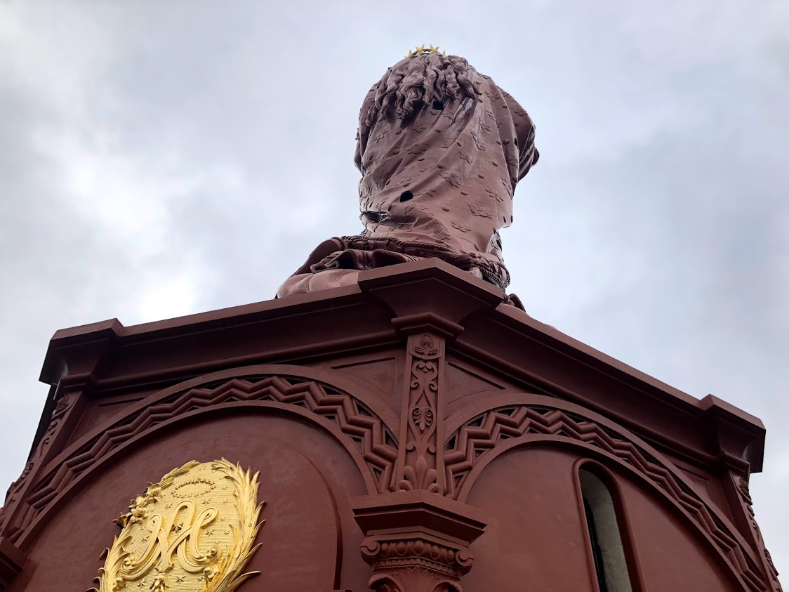 到着。 マリア像の中は入って上れるようになっていて、星形の冠の上から顔をだすことができます。