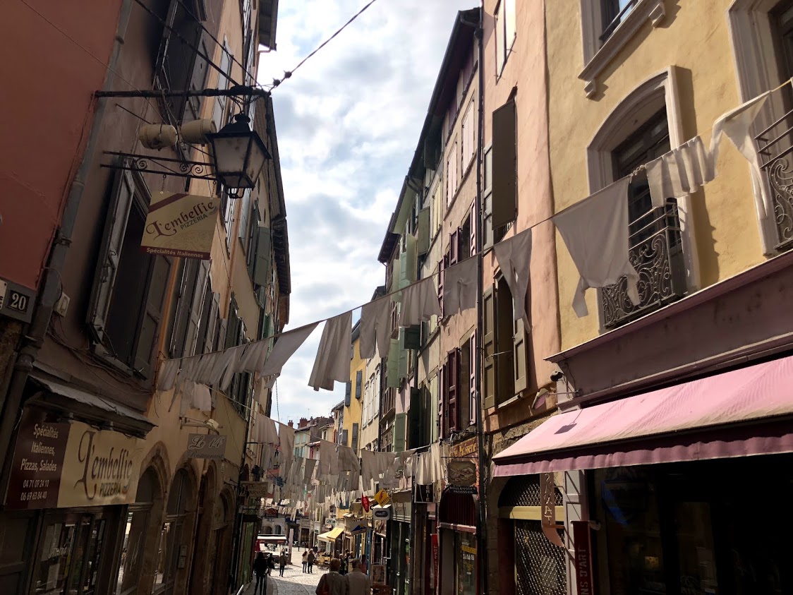 This street is colourful. The statue of "Notre-Dame de France" on "The Corneille rock" is seen over the street. |