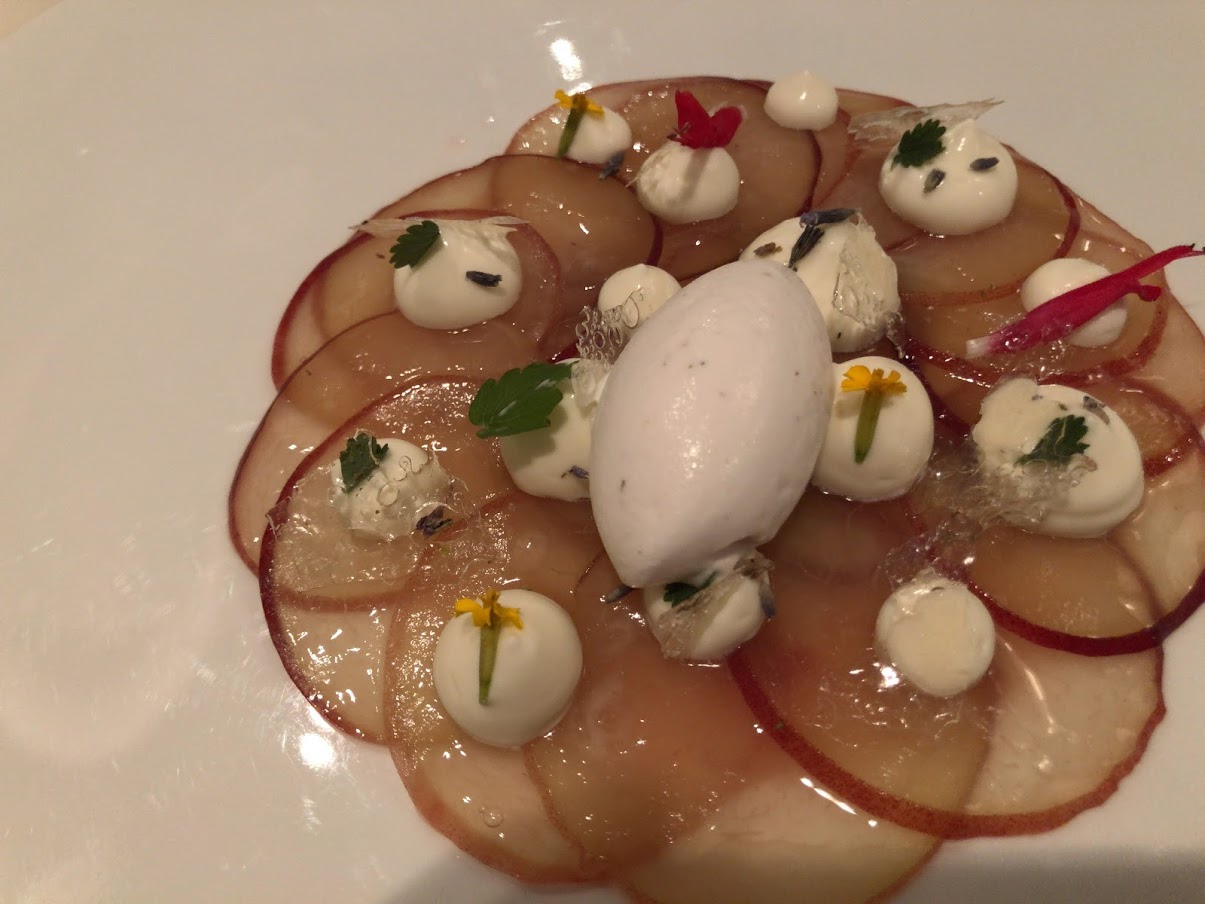 今日いちばんのヒット作。 桃のカルパッチョ。確かに桃なんだけど、食べたことのないおいしさ。シェフの独創性が光るデザートでした。ごちそうさまでした。