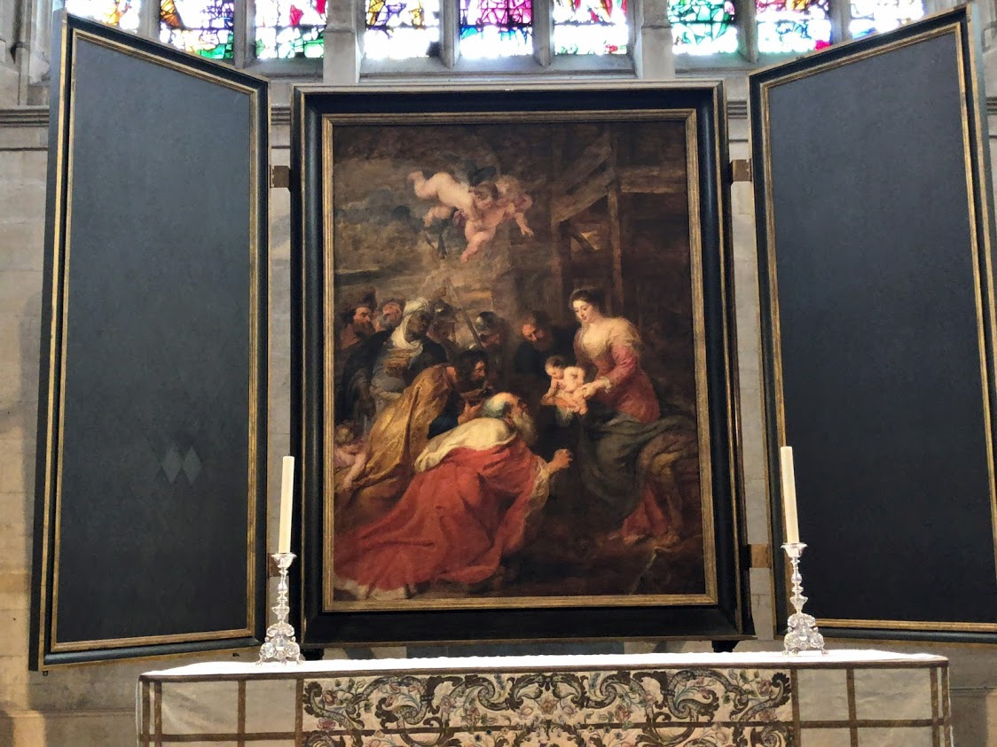 主祭壇にあるルーベンス「三賢人の礼拝」(1616年-1617年)。1959年に不動産長者のAlfred Ernest Allnattに世界最高額で購入され、2年後に彼はキングス・カレッジにその寄付を申し入れました。カレッジはこの「気前の良い贈り物」をチャペルに恐らく祭壇画として飾るということで受け入れました。絵は当初、教会の内陣西側の部屋に飾られていましたが、教会東側の改修が行われ1968年にそこへ移設され、現在もそこにあります。