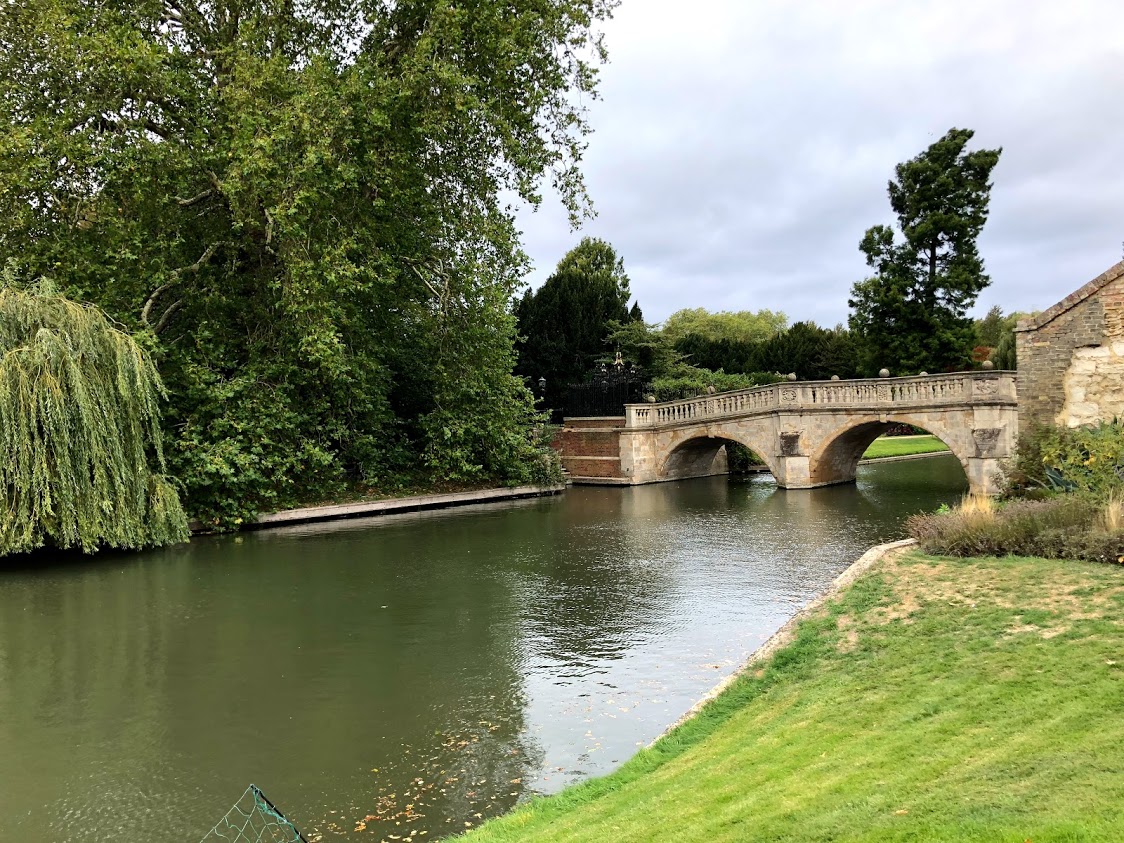 カレッジからケム川。 この辺りのアングロ・サクソンの入植地は「グランタ橋」として知られるようになりました。中世英語によって入植地の名前は「ケンブリッジ」と変わり、グランタ川の下流地域は名前に合わせてケム川に名前が変わりました。