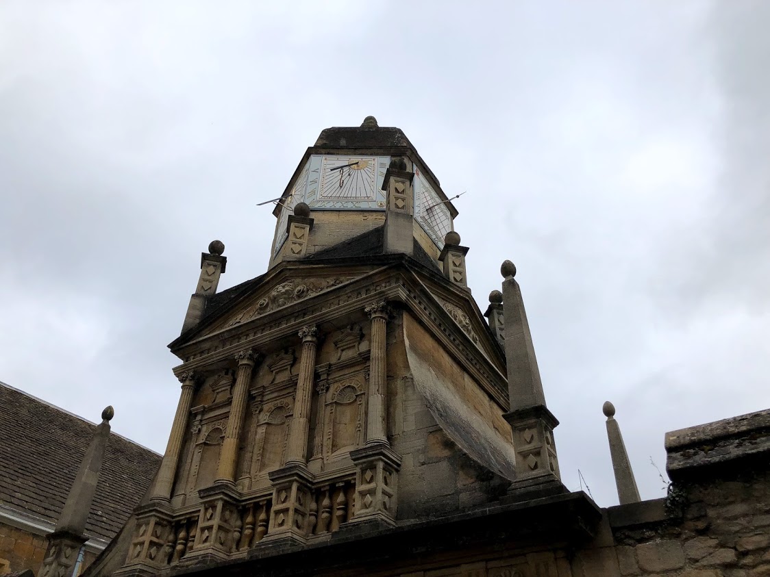 到着。これは大門です。人気の伝説によるとこのカレッジには複数のゴーストが住んでいます。1706年には4人の研究者がカレッジの向かいの家で呻き声がする方向に拳銃を発射して脅かすという単純な方法で除霊しています。
