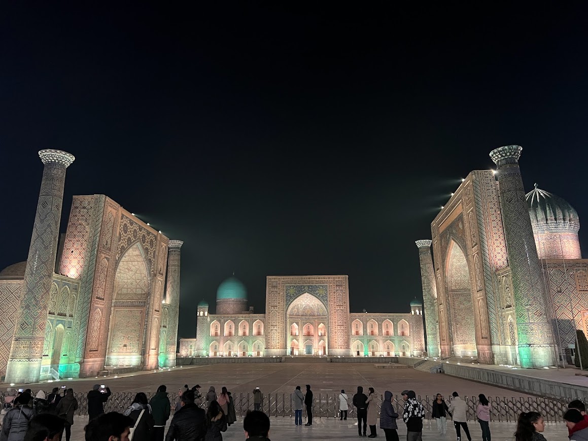 サマルカンドの旧市街地のホテルに到着。レギスタン広場までは徒歩5分。夜はライトアップされているらしいので歩いて向かっています。 |