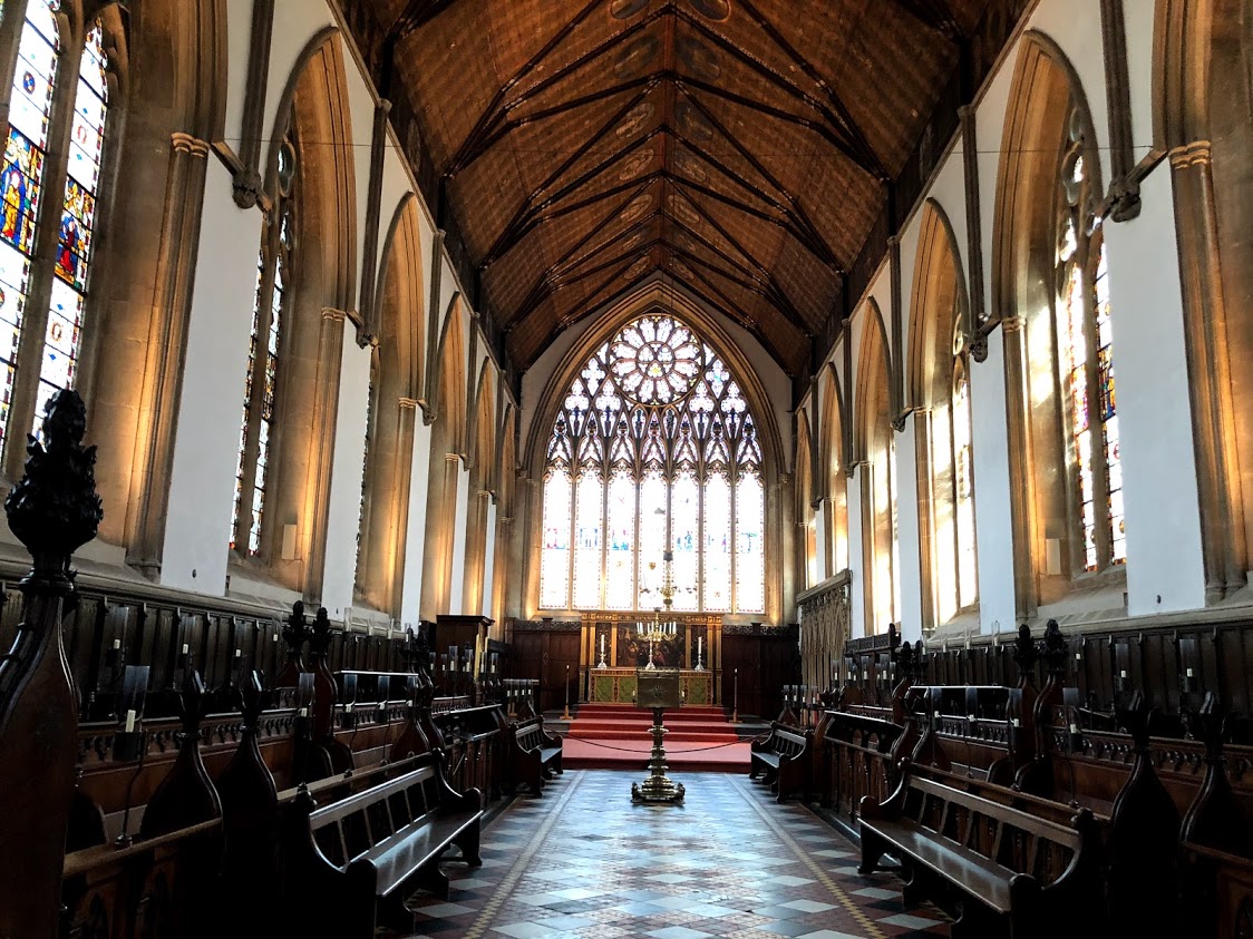 「マートン・カレッジ礼拝堂」 礼拝堂もシンプル。現在の教会の建築は1290年ごろ始まりました。巨大な東側の窓を伴った聖歌隊席は1294年に完成しました。