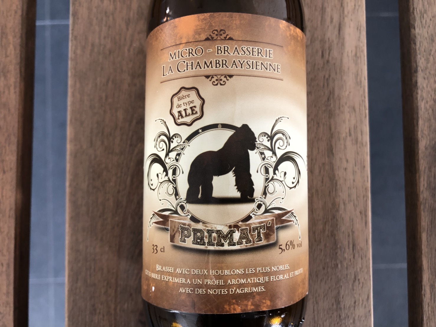 「プリマット Primat」 フランスのラ・シャンブレイゼン醸造所の製品。オレンジ色で大きく白い泡立ち。麦芽、酵母、果物の香り。少し甘く、麦芽と果物の味がします。アルコール度数は5.6%。
