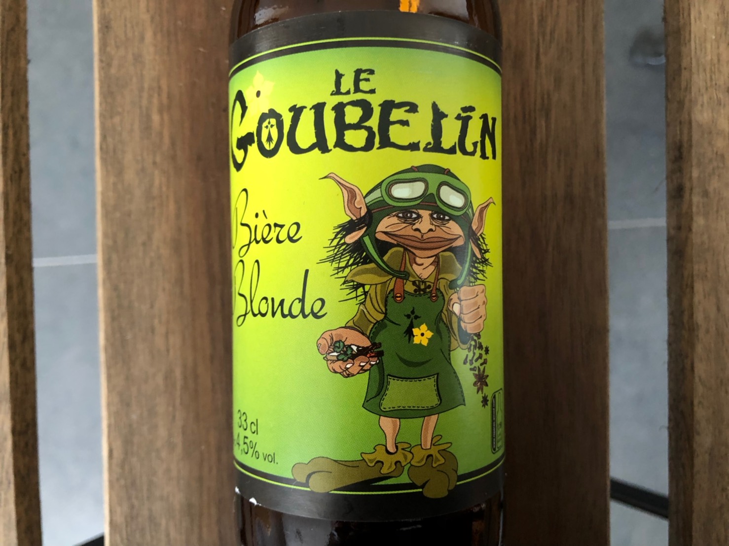 「レ・グベラン・ビア・ブロンド Le Goubelin Biere Blonde」 フランスのグベラン醸造所の製品。金色で薄く白い泡立ち。麦芽、果物、酵母の味と香り。アルコール度数は4.5%。