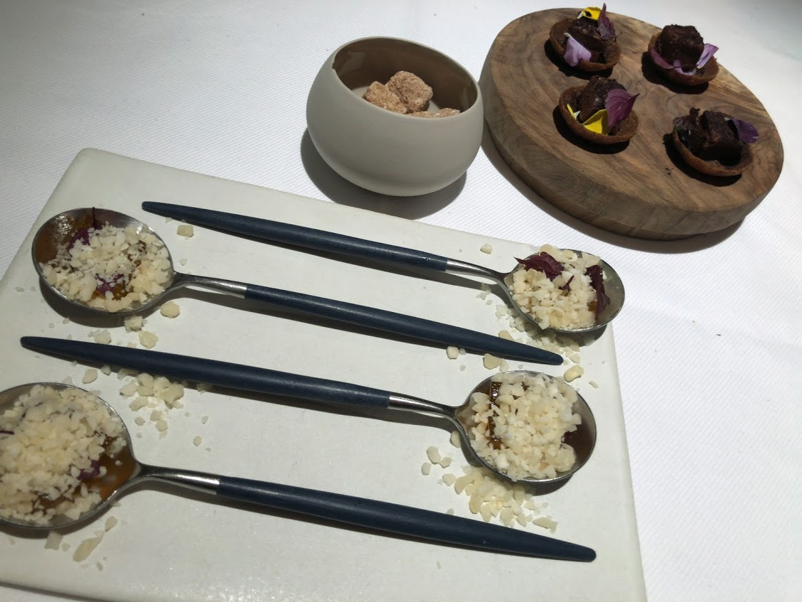 お友だちと合流してお茶をして…お夕飯のレストラン「Yoshinori」に移動。6月にベルギーにいらした友人のご親戚ご夫妻からパリへ来る前々日にラインをいただきました。「今、パリにいるのよー」と。 アミューズです。