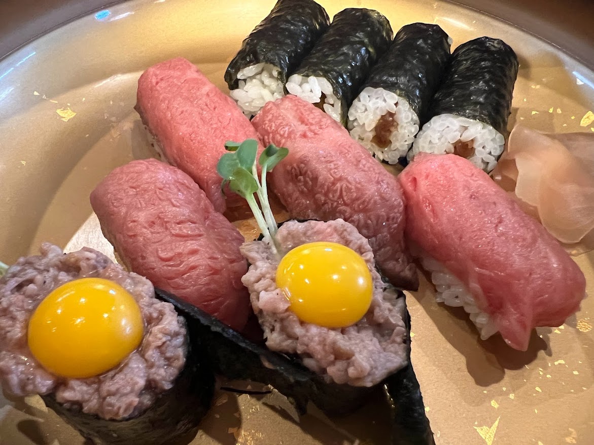 こちらが前沢牛のお寿司。軍艦は前沢牛が甘辛に煮てあるもの。 私たちの後から来た人は断られてた。人気店みたいです。 |