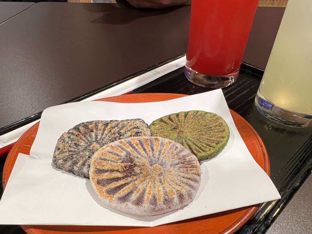 会館の1階には「あるでよ徳島」という物産館があります。その中に「和田乃屋」という老舗の和菓子屋さんが入っていて、「滝の焼餅」が食べられます。「滝の焼餅」は天正十三年蜂須賀蓬庵家政公が、阿波25万石の国主として徳島城を築き、その祝いに献上されたという、歴史あるお菓子。白、抹茶、ごま味があったのでひとつずついただきました。 |