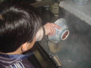 昨日からセルフセルフと言っていますが、ここでちょっとご説明です。讃岐うどんはセルフサービスで安いことが有名です。セルフサービスといっても料理を運んだり片付けたりといったビュッフェ形式のことではなく、茹でるところからセルフな店もあります。先ずカウンター越しに大中小といったサイズのみ注文します。するとどんぶりに適量の麺をいれてホイっと渡されます。そこでお好みに合わせてこうやって湯をくぐらすのです。 |