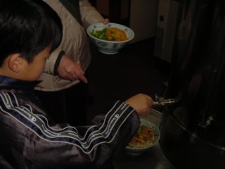 そしてお好みのてんぷら等のトッピングを行い、このような蛇口で出汁を入れるのがセオリー。もちろんこれはかけで食べる場合で、生醤油やぶっかけの場合はかけるものが違います。さらにここでネギのトッピングも行います。また、店によってもセルフの範ちゅうが違いますので要注意です。フリークな方のホームページではそれぞれのセオリーが明記されている場合があります。 |
