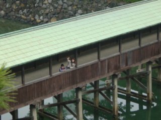 そうこうしているうちに雨も上がって玉藻公園で高松城跡の見学です。ここのお堀は海水です。普通は鯉なんかが泳いでいるもんですが、ここではふぐ・チヌ・ボラなんかが泳いでいます。なんかへん。 |