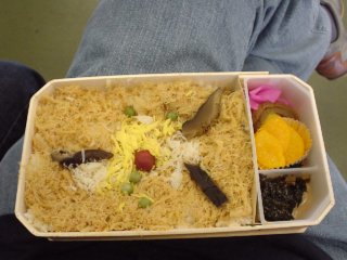 | というわけで昼食は駅弁にしました。鮭弁当。 |