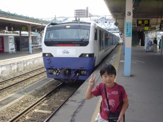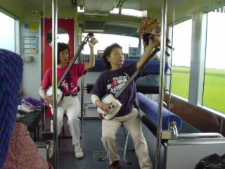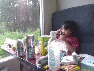 | ここからは信じてもらえないかもしれません。でも事実だけを述べるのがウチのホムペのポリシーです。この列車最前車両には展望席があり、そこで津軽三味線の生演奏があります。(ほんまやって!) |