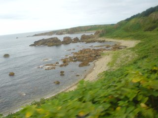 | なんといってもいちばんすばらしいのはこの景色。五能線は海岸すれすれの線路です。こんな景色がずっと続きます。途中景色が最高なところは徐行運転のサービスつき! |