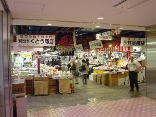 | 駅前に戻ってきました。ここでも魚貝を売る市場があります。ホヤも売ってました。こんなん買う人いるのかなぁ。イカやまぐろもとっても安価でした。実はトロを買ってしまいました。 |