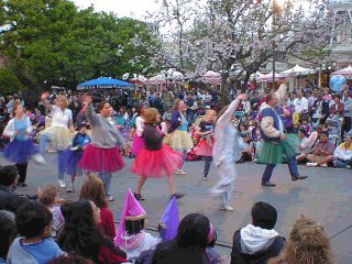 パレードはTDLのそれよりもずっと小規模です。でもとってもアットホームです。地元の高校生ブラスバンドがあったり、ゲストが一緒に踊ったり。この写真では超オヤジがひらひらスカートをつけて踊っています。でも外人はなぜかカッコイイんだなぁ。これが。