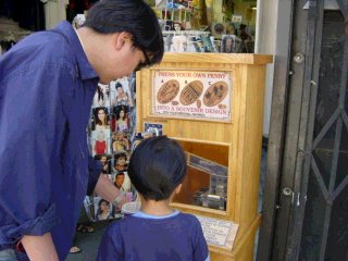 アメリカの観光地にはこんな機械がよくあります。51セントを入れると1セント硬貨(ニッケル)をプレスして観光地のデザインが印字されます。お金を改造してはいけない日本ではできない商売ですね。