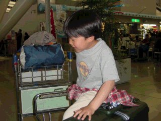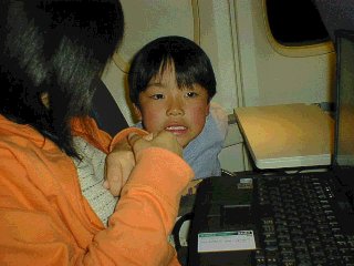 機内のりゅうちゃん。持参のノートPCでゲームをしたり、トランプをしたりしてすごしました。 | |
