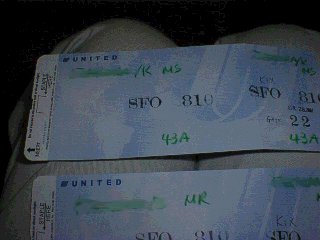 チェックインの時にユナイテッド航空のコンピュータがダウンしたとかで、なんと手書きの航空券。 | |