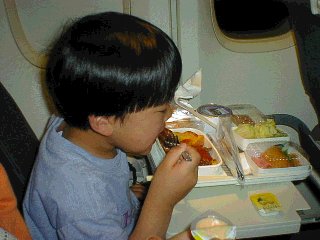 最初の機内食はカツカレーとビーフのなんとかの選択制でした。りゅうはビーフ、ぱぱままはカツカレー。味はまあまあ。 | |