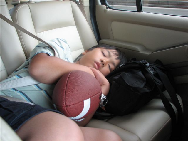 帰りの車中、りゅういちは疲れて爆睡中。 そのボール、よっぽど気に入ってんなぁ。よかったねー。 |